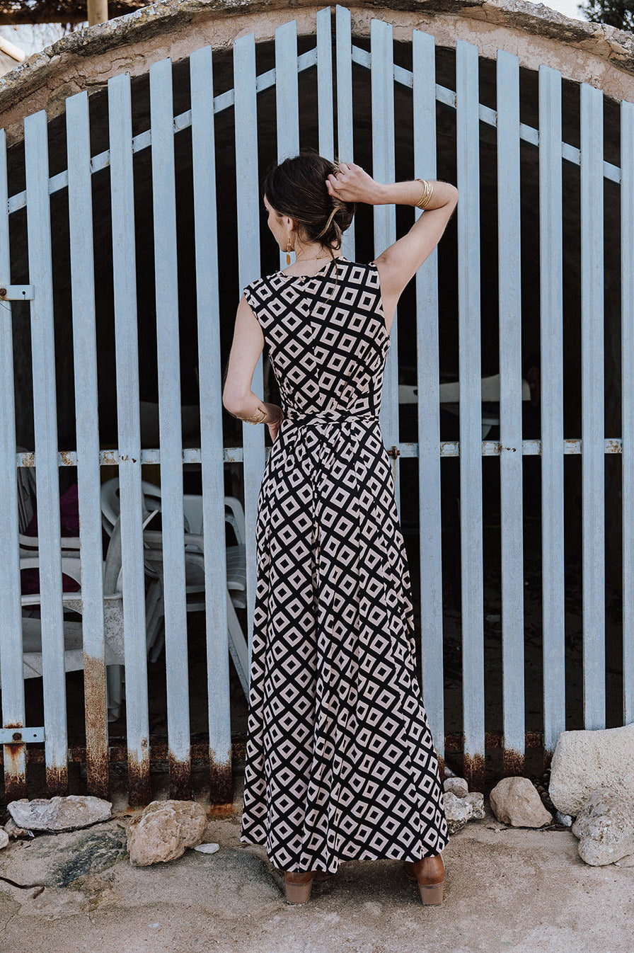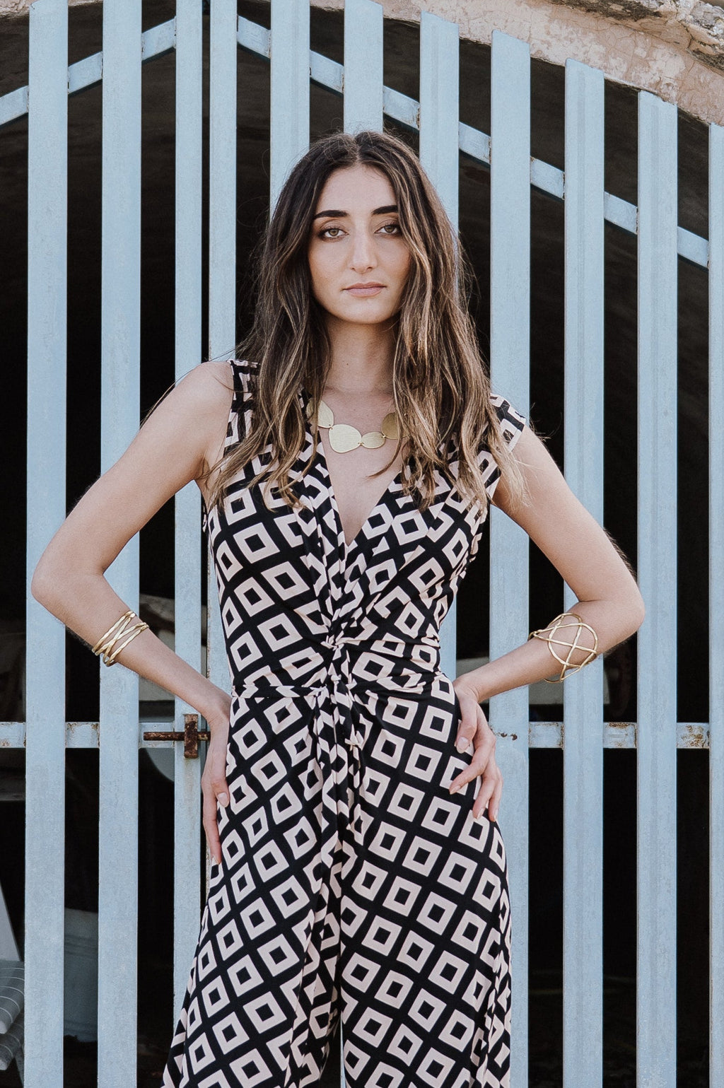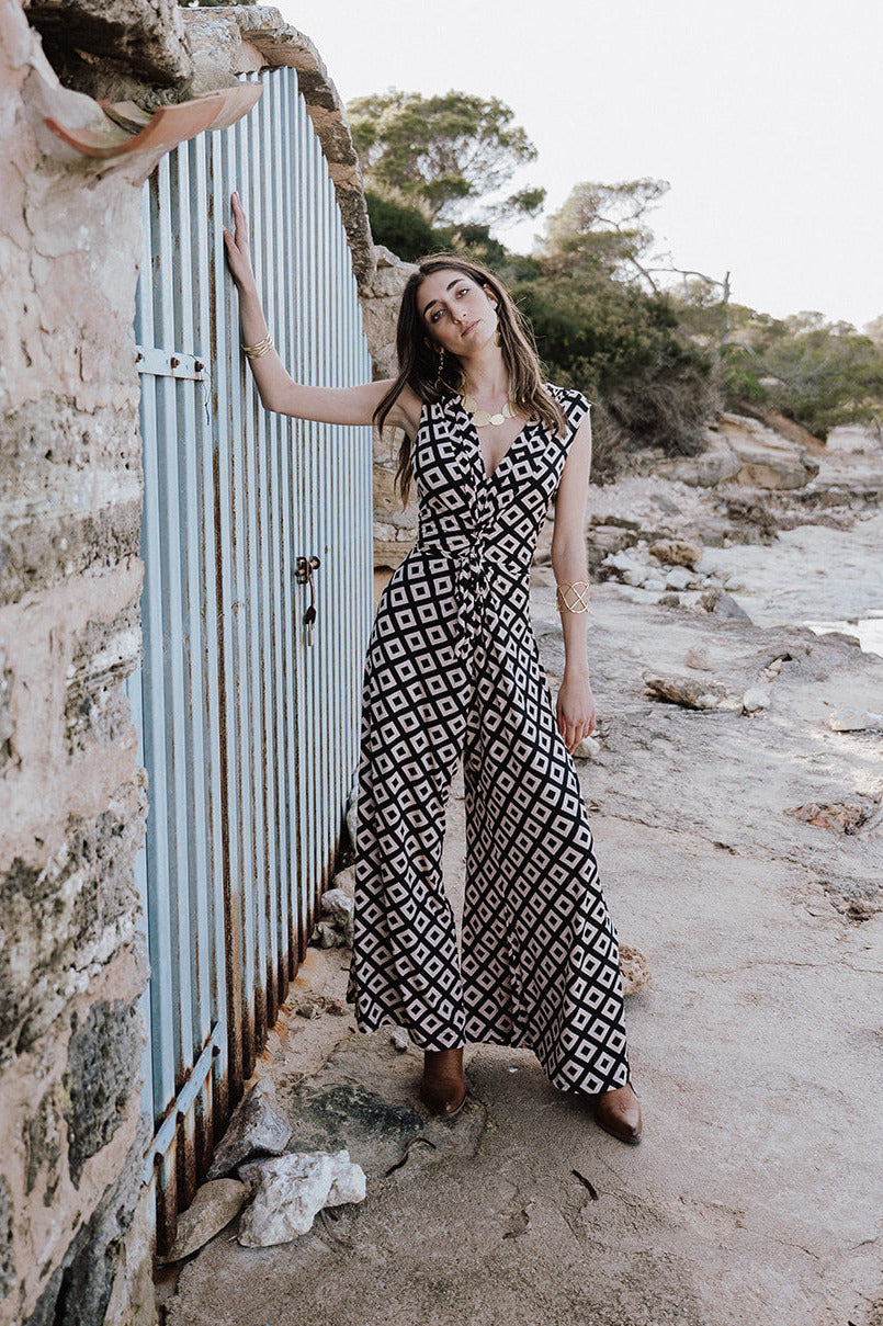 This 70s inspired one-piece is truly eye-catching. It has a V-neck and an extra wide leg which gives it a real retro feel. It can be fully adjusted by tying the two fabric strings on the back, giving you a beautifully femenine top and a wide playful bottom part at the same time.