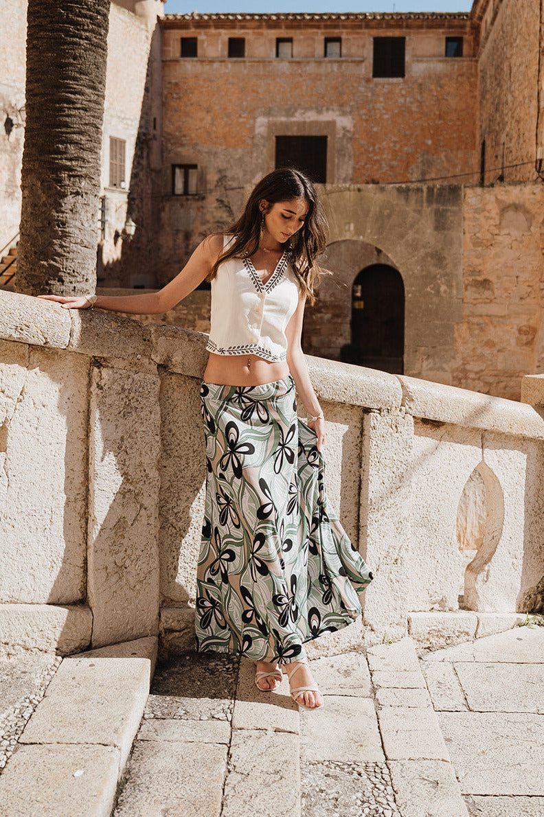 This is the perfect long skirt that sits nicely on your waist (lower or higher, your choice) but doesn's cling to your hips. The waist is elastic, so there are no zippers and no buttons. The nice flowy fabric makes it ideal for spring and summer days. The retro print mixes light green with beige, white and black. Easy to match with any color top.