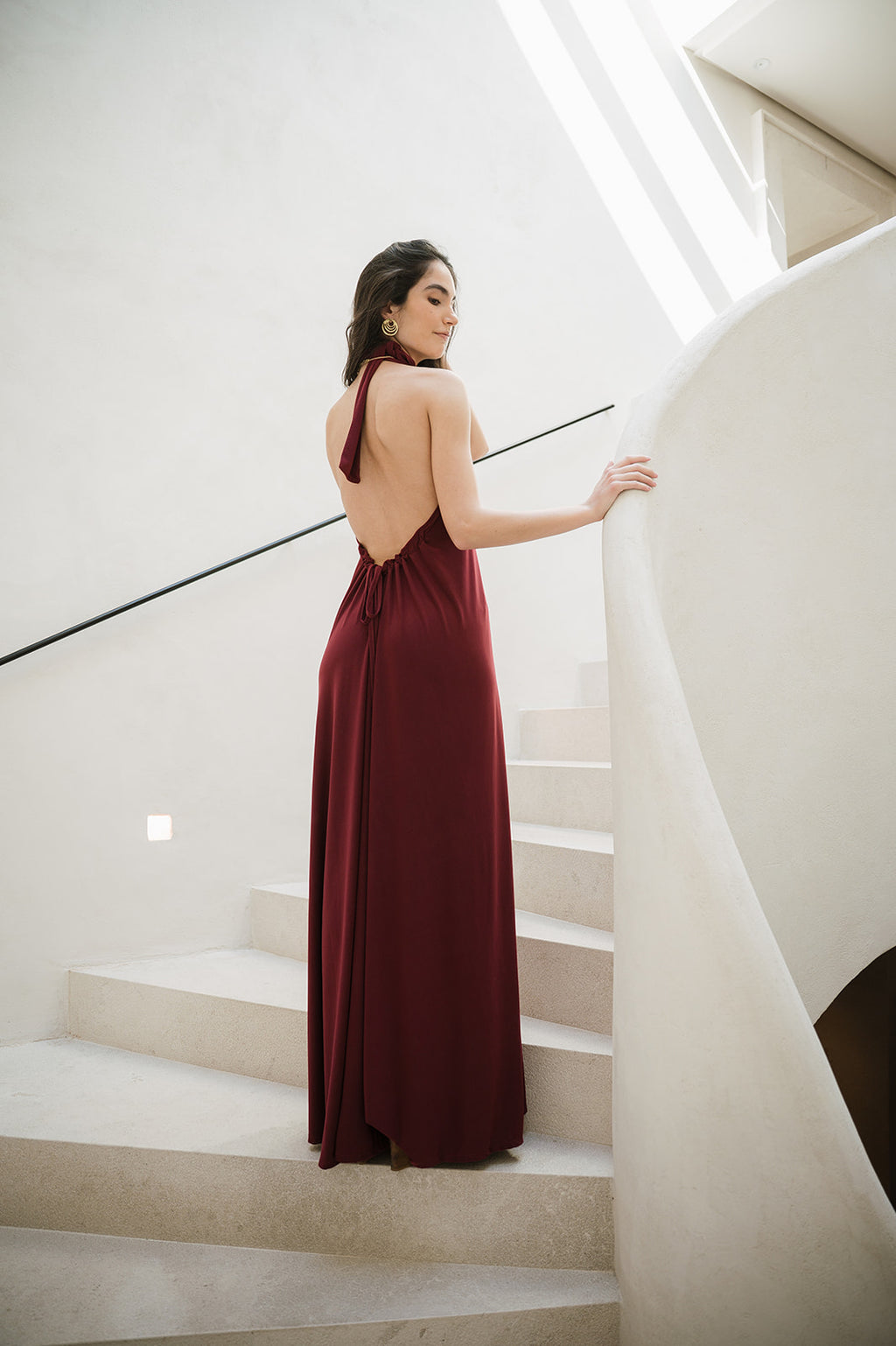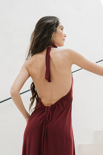 Looking for a jaw dropping dress? This is the one! Tie it around your neck (or give it twist to create a choker with the fabric), tighten it at the back, and let it flow! This beautiful burgundy color is elegant and feminine. With an open back and a deep plunging neckline, you're guaranteed to turn heads.